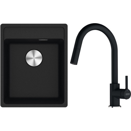 Cenově zvýhodněný set Franke G293O obsahuje granitový dřez jednodřez MRG 610-37 RTL Onyx a baterii s vytahovací koncovkou FC 6051.071 LINA Onyx.