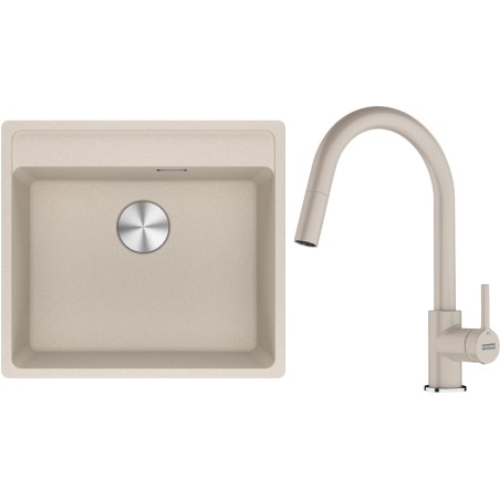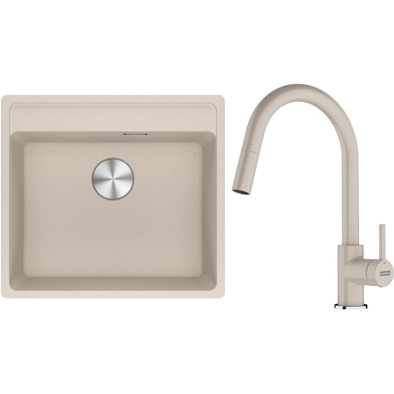 Cenově zvýhodněný set Franke G296SA obsahuje granitový dřez jednodřez MRG 610-52 RTL Sahara a baterii s vytahovací koncovkou FC 6051.082 LINA Sahara.