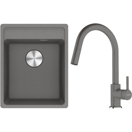 Cenově zvýhodněný set Franke G293ŠK obsahuje granitový dřez jednodřez MRG 610-37 RTL Šedý kámen a baterii s vytahovací koncovkou FC 6051.084 LINA Šedý kámen.