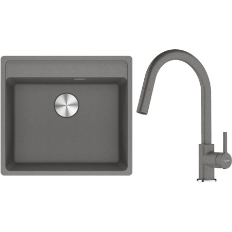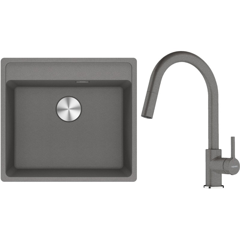 Cenově zvýhodněný set Franke G296ŠK obsahuje granitový dřez jednodřez MRG 610-52 RTL Šedý kámen a baterii s vytahovací koncovkou FC 6051.084 LINA Šedý kámen.