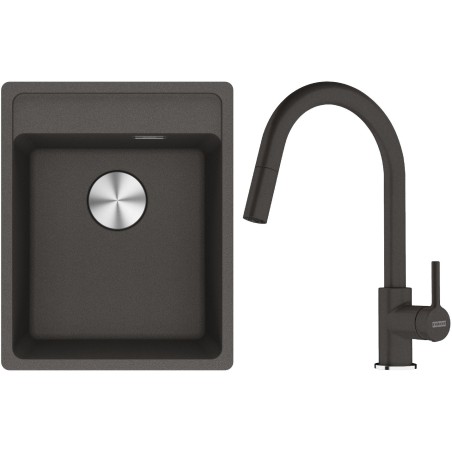 Cenově zvýhodněný set Franke G293ŠB obsahuje granitový dřez jednodřez MRG 610-37 RTL Šedá břidlice a baterii s vytahovací koncovkou FC 6051.088 LINA Šedá břidlice.