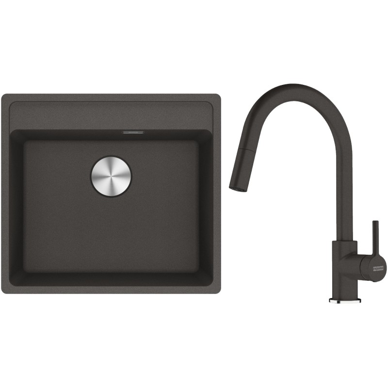 Cenově zvýhodněný set Franke G296ŠB obsahuje granitový dřez jednodřez MRG 610-52 RTL Šedá břidlice a baterii s vytahovací koncovkou FC 6051.088 LINA Šedá břidlice.