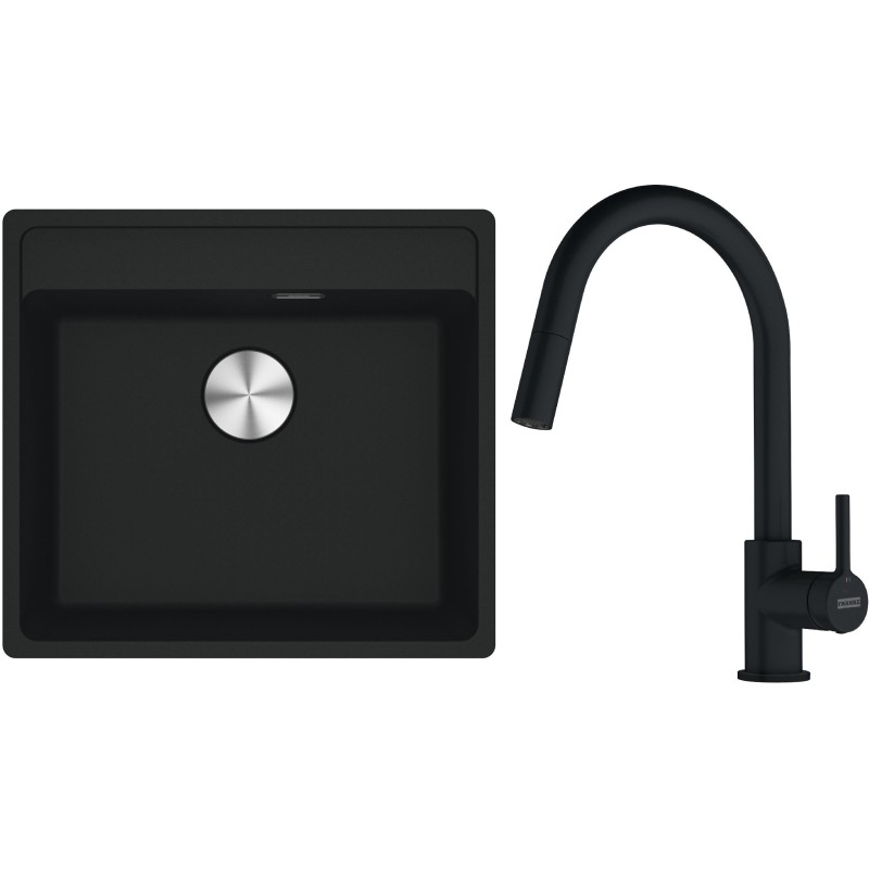 Cenově zvýhodněný set Franke G296MČ obsahuje granitový dřez jednodřez MRG 610-52 RTL Matná černá a baterii s vytahovací koncovkou FC 6051.901 LINA Matná černá.