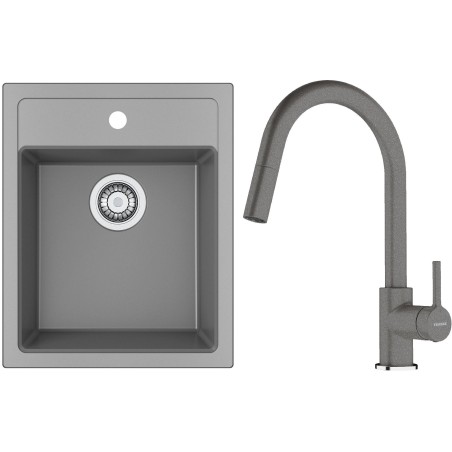 Cenově zvýhodněný set Franke T129Š obsahuje Tectonite dřez jednodřez SID 610-40 Šedá a baterii s vytahovací koncovkou FC 6051.084 LINA Šedý kámen.