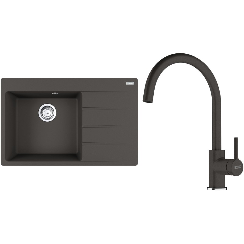 Cenově zvýhodněný set Franke G272ŠB obsahuje granitový dřez s odkapem CNG 611-78 TL/2 Šedá břidlice a baterii FC 6018.088 LINA Šedá břidlice.