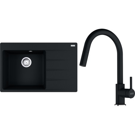 Cenově zvýhodněný set Franke G292O obsahuje granitový dřez s odkapem CNG 611-78 TL/2 Onyx a baterii s vytahovací koncovkou FC 6051.071 LINA Onyx.