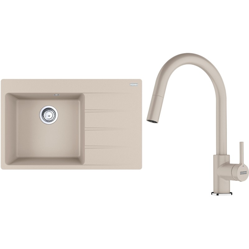 Cenově zvýhodněný set Franke G292SA obsahuje granitový dřez s odkapem CNG 611-78 TL/2 Sahara a baterii s vytahovací koncovkou FC 6051.082 LINA Sahara.