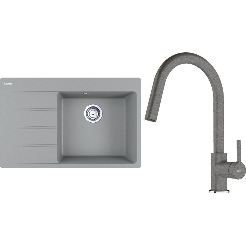 Cenově zvýhodněný set Franke G291ŠK obsahuje granitový dřez s odkapem CNG 611-78 TL/7 Šedý kámen a baterii s vytahovací koncovkou FC 6051.084 LINA Šedý kámen.