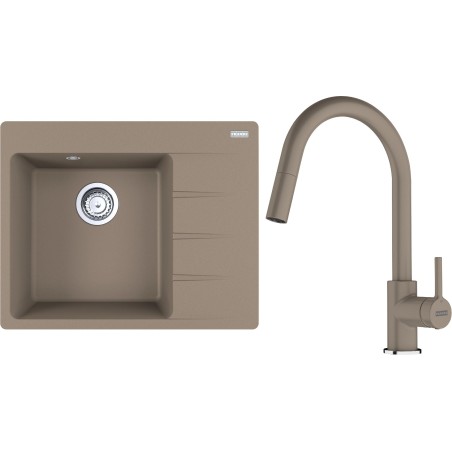 Cenově zvýhodněný set Franke G286KA obsahuje granitový dřez s odkapem CNG 611-62 TL/2 Kašmír a baterii s vytahovací koncovkou FC 6051.424 LINA Kašmír.