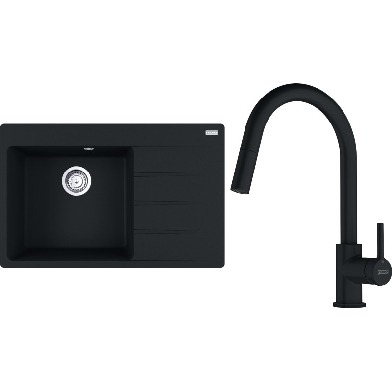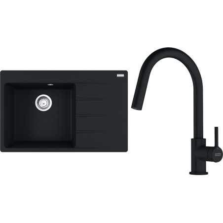 Cenově zvýhodněný set Franke G292MČ obsahuje granitový dřez s odkapem CNG 611-78 TL/2 Matná černá a baterii s vytahovací koncovkou FC 6051.901 LINA Matná černá.
