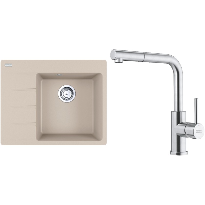 Cenově zvýhodněný set Franke G283SA obsahuje granitový dřez s odkapem CNG 611-62 TL/7 Sahara a baterii s vytahovací koncovkou FC 6986.501 SMART GLENDA Celonerez.