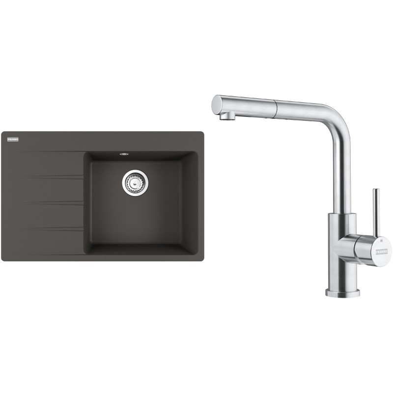 Cenově zvýhodněný set Franke G289ŠB obsahuje granitový dřez s odkapem CNG 611-78 TL/7 Šedá břidlice a baterii s vytahovací koncovkou FC 6986.501 SMART GLENDA Celonerez.