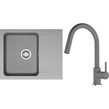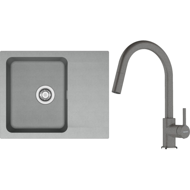 Cenově zvýhodněný set Franke T126Š obsahuje Tectonite dřez s odkapem OID 611-62 Šedá a baterii s vytahovací koncovkou FC 6051.084 LINA Šedý kámen.
