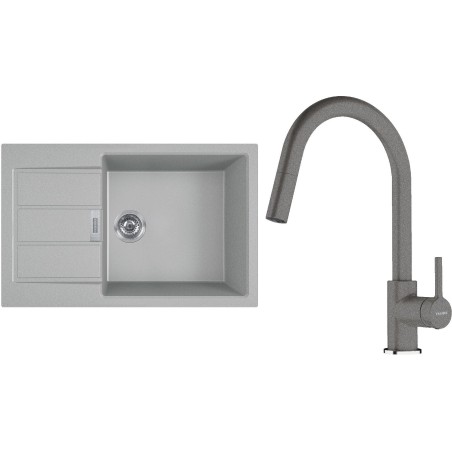 Cenově zvýhodněný set Franke T132Š obsahuje Tectonite dřez s odkapem S2D 611-78 XL Šedá a baterii s vytahovací koncovkou FC 6051.084 LINA Šedý kámen.