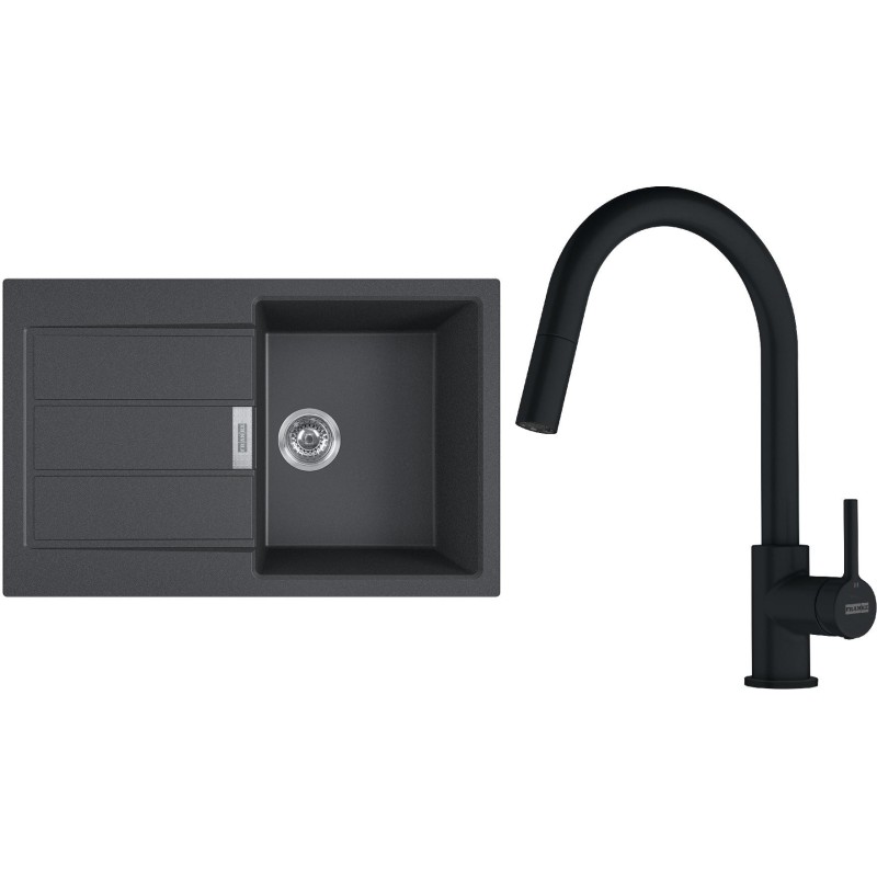 Cenově zvýhodněný set Franke T131Č obsahuje Tectonite dřez s odkapem S2D 611-78 Černá a baterii s vytahovací koncovkou FC 6051.901 LINA Matná černá.